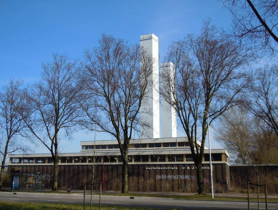 hulpwarmtecentrale stadsverwarming, ontwerp architect ir. J.A. Mijnlief voor de PEGUS, 1968 en 1970 (uitbreiding in identieke stijl met 2e schoorsteen). Beeldbepalend, o.a. vanwege de dubbele schoorsteen. Cascobescherming.